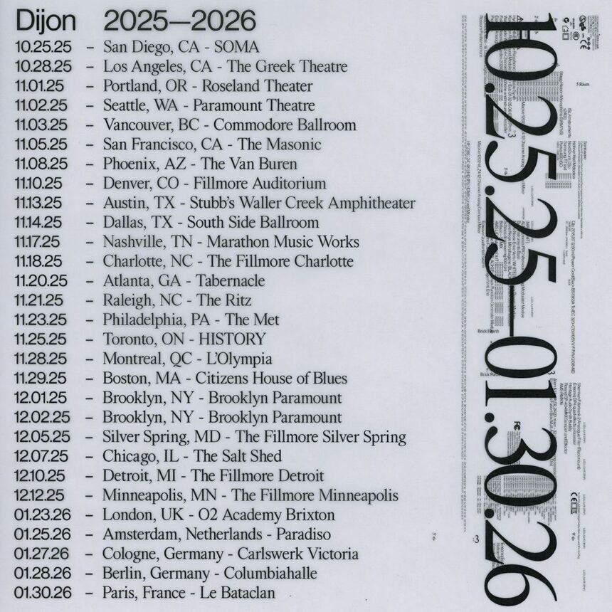 Dijon has announced a tour of North America and Europe behind new album Baby. A North American run kicks off in San Diego on October 25, taking in a number of West Coast cities before moving inland and heading East—including two nights at Brooklyn Paramount—through the remainder of the year. A European stint follows in January 2026, with dates in England, the Netherlands, Germany, and France. Check out the itinerary below.