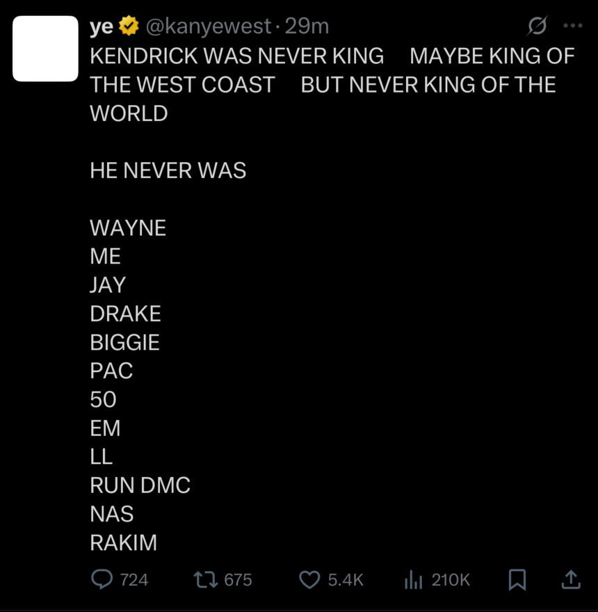 Kanye is doing kind of the opposite thing; taking shots at Playboi Carti, Jay-Z, Beyoncé and now Kendrick (again). According to Kanye, Kendrick doesn’t even deserve to be in a top 12 rapper slot. He does, however, put Drake in there. Now, is that provocation or facts? Only Ye knows.
