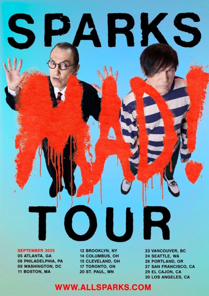 Sparks have announced a 2025 North American leg of their upcoming tour, which has its first run in Japan, the UK, and Europe in June and July. They’ll return to the States on September 5, with a string of shows in Atlanta, Boston, St. Paul, Seattle, San Francisco, and more, wrapping things up in Los Angeles on September 30. The brothers Mael have also shared a new single from their next LP, Mad! Watch the Ambar Navarro-directed video for “Drowned in a Sea of Tears” below, and scroll down for their complete itinerary.