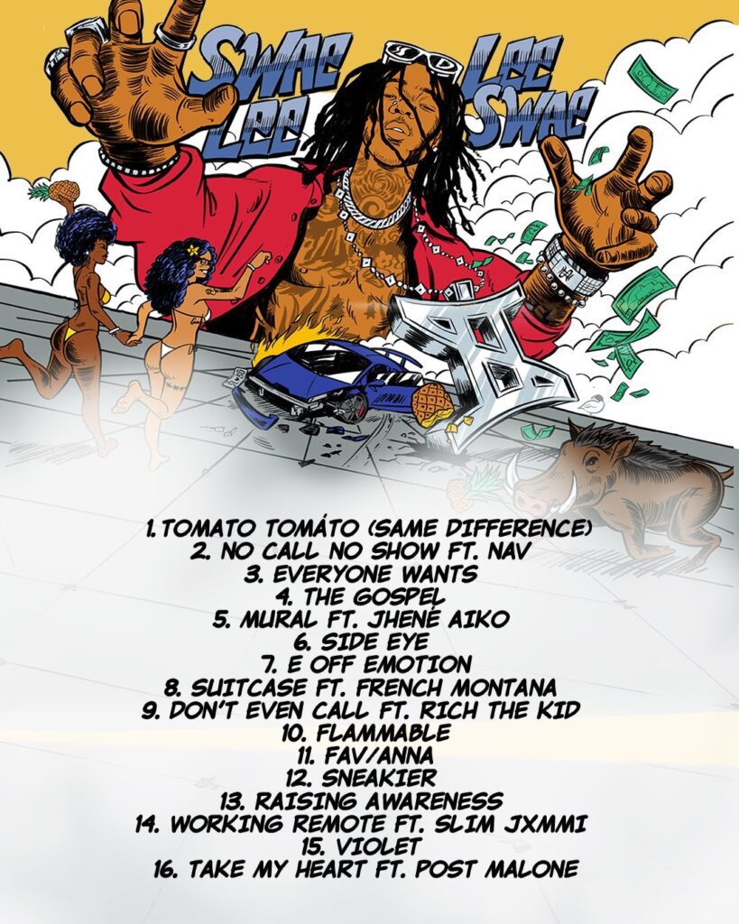 The album cover is a vibrant one — with Swae Lee in jeans staring at a mixed media mosaic of different parts & interpretations of himself. This, in contrast with the white backdrop really makes the message pop. The feature list is just as vibrant.
