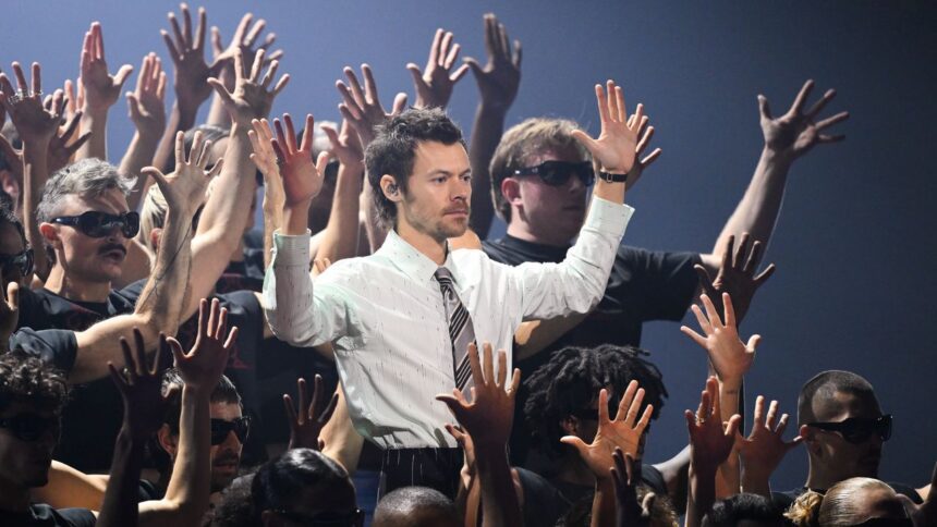 Although Styles wasn’t up for any BRITs this year, he popped up multiple times throughout the broadcast. Ahead of the show, host Jack Whitehall portrayed a Styles fan starved for new music who, upon encountering the star’s dressing room at the BRITS, shed a single tear of joy and relief. Later on, Whitehall also had to fend off a male pursuer modeled after the one in Styles’ “Aperture” music video.